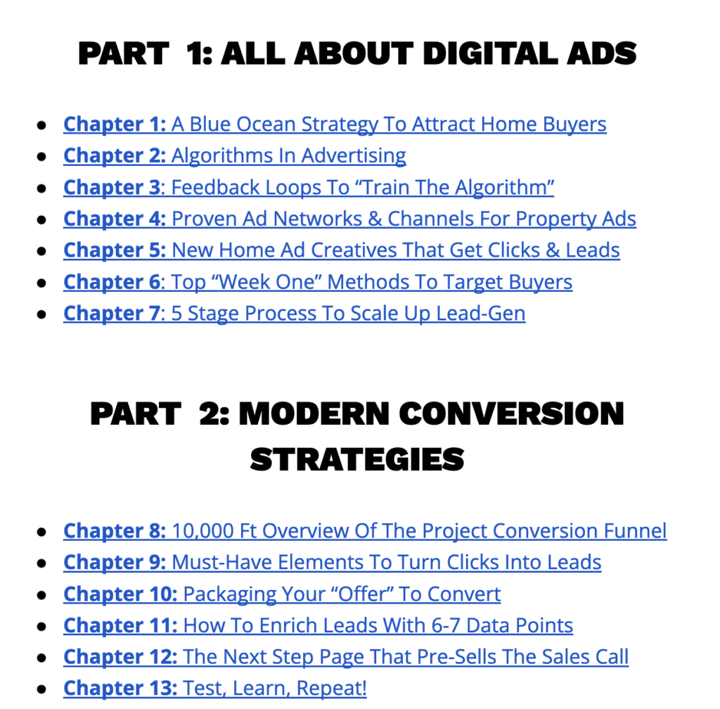 13 chapters. 160+ pages. All focused on one thing: helping you acquire prospects & sell more new homes.